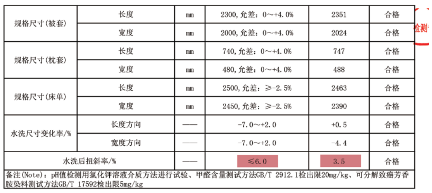 奈特綿®水洗后扭斜率檢測(cè)結(jié)果