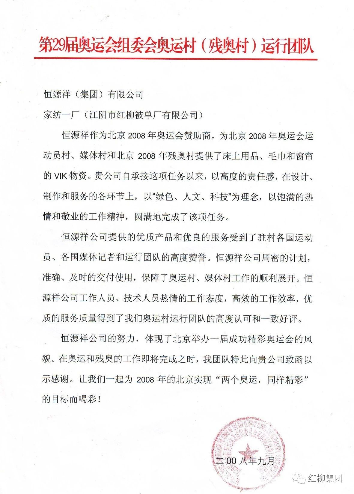 2008北京奧組委發(fā)來的感謝信