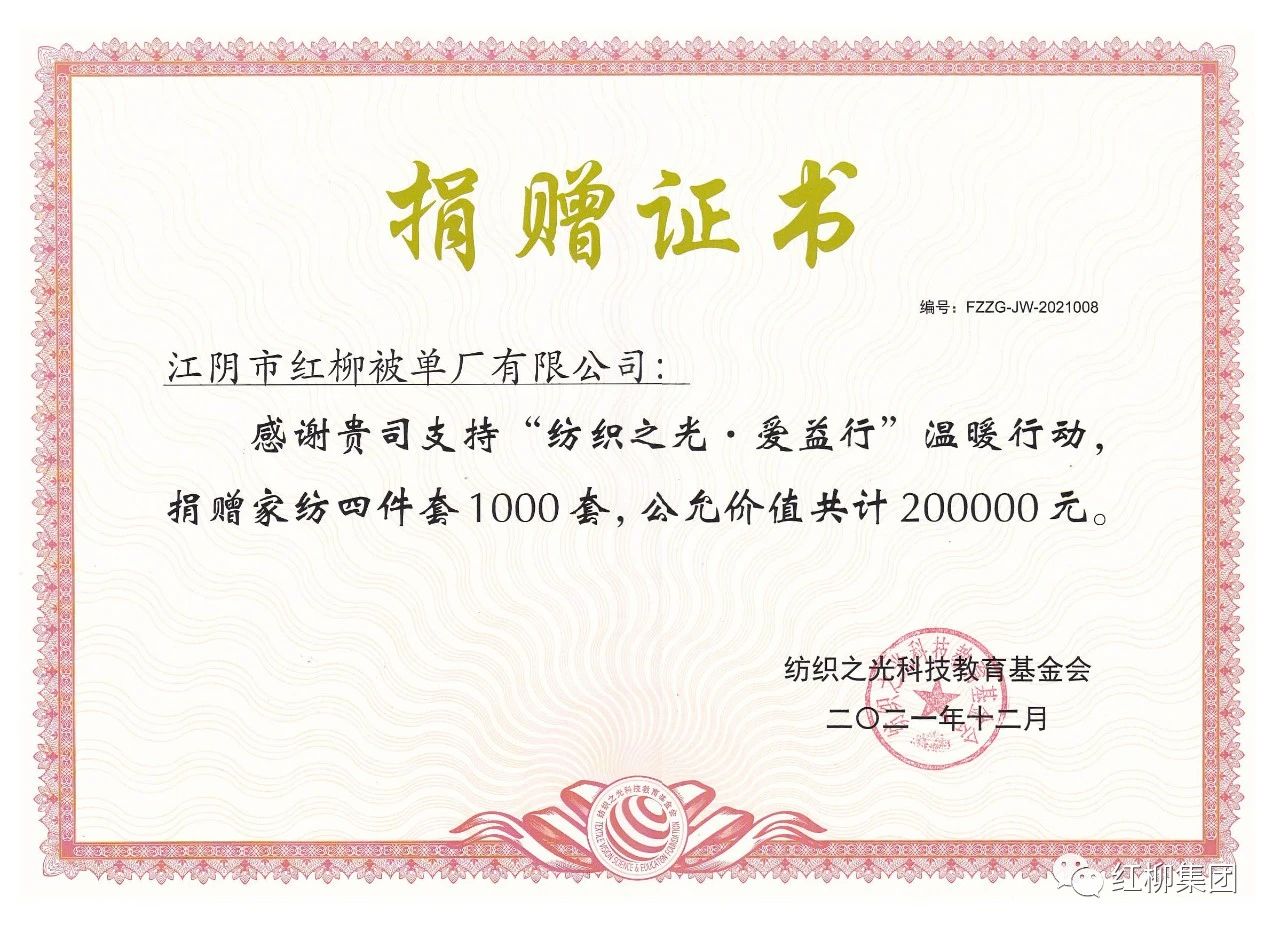 紅柳一直心系社會,近年來在關愛老人、教育幫扶、配合防疫等方面為社會奉獻愛心。2019年,紅柳還參與紡織之光基金會開展的“紡織之光·愛益行”溫暖哈青小學行動,為貴州山區(qū)的孩子們捐贈了價值19.14萬元的學生六件套床上用品300套。