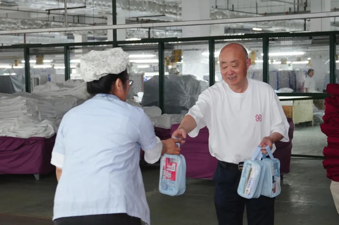 陳董攜集團(tuán)領(lǐng)導(dǎo)慰問堅(jiān)守在生產(chǎn)一線的員工家人們,并送上慰問品,傳遞關(guān)懷與溫暖。